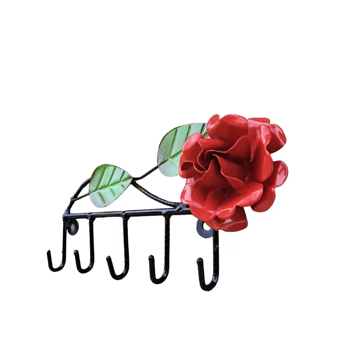 Porta chave de parede com flor dando vida e cor ao ambiente, com 5 ganchos para pendurar chaves, também podendo ser usado para pendurar outras coisas. Além de organizar é um excelente enfeite para seu ambiente. Ferragem possui pintura eletrostática para não enferrujar e não arranhar com facilidade, material resistente, garantindo assim maior durabilidade. Excelência no acabamento, para maior valorização do produto.